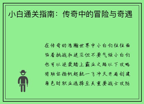 在传奇的浩瀚世界中,小白们往往面临着挑战和迷茫。但不要气馁,小白们也可以逆袭,踏上霸业之路!以下攻略将助你扬帆起航,一飞冲天! 开局尊龙凯时人生就是搏 创建角色时,职业选择至关重要。战士攻防兼备,法师远程输出高,道士辅助能力强。小白推荐选择战士,既能抗伤害又能输出。 升级 ...